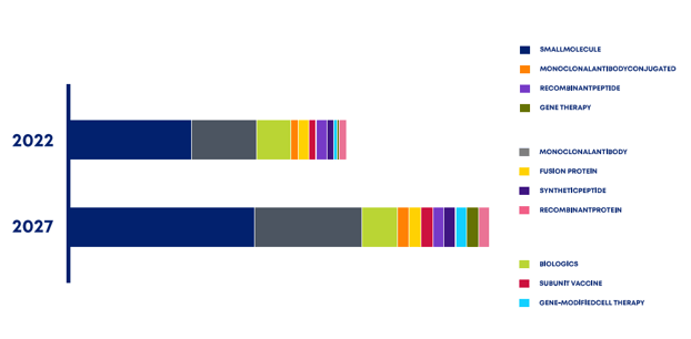 The biotechnology industry’s progress has led to the emergence of various niche biotherapeutic classes, creating substantial opportunities for contract service providers. A multitude of new drug candidates is presently in the R&D discovery and preclinical stages, featuring bispecific antibodies, antibody, gene therapy, and cell therapy drug candidates. Projections indicate that these segments are poised for an annual growth rate exceeding 20 percent by 2027 (Fig.2).